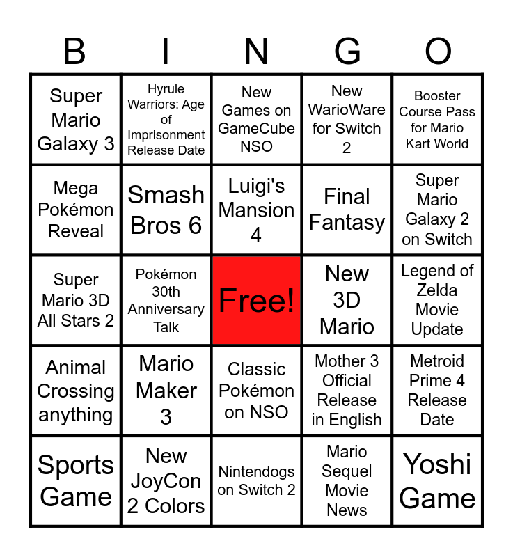 This bingo card has a free space and 37 words: Rhythm Heaven Groove Release Date, Tomodachi Life: Living the Dream Switch 2 Upgrade/Release Date, New Amiibos, Smash Bros 6, Metroid Prime 4 Release Date, Mario Maker 3, Luigi's Mansion 4, Free Update to Mario Kart World, Booster Course Pass for Mario Kart World, Mario 40th Anniversary Talk, Pokémon 30th Anniversary Talk, New WarioWare for Switch 2, Yoshi Game, Legend of Zelda Movie Update, Mega Pokémon Reveal, Animal Crossing anything, Splatoon Raiders Info, New Games on GameCube NSO, Classic Pokémon on NSO, New 3D Mario, Super Mario Galaxy 3, Super Mario Galaxy 2 on Switch, Sports Game, Nintendogs on Switch 2, Donkey Kong Bananza DLC, Mario Sequel Movie News, Hyrule Warriors: Age of Imprisonment Release Date, New Pokémon Game, New Professor Layton Release Date, Fire Emblem, Switch 2 Special Edition Console, New JoyCon 2 Colors, Super Mario 3D All Stars 2, New Switch 2 Editions for Switch Games, Mother 3 Official Release in English, Final Fantasy and "A Demo Will Be Available After This Presentation".