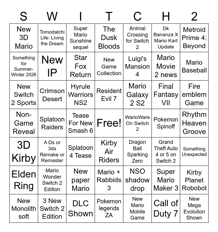 This bingo card has a free space and 48 words: NSO shadow drop, Mario Movie 2 news, Pokemon legends ZA, Splatoon Raiders, Hyrule Warriors NS2, Rhythm Heaven Groove, Tomodatchi Life: Living the Dream, 3 New Switch 2 Edition, Dk Bananza X Mario Kart Update, Kirby Air Riders, Metroid Prime 4: Beyond, The Dusk Bloods, Final Fantasy VII, Mario Galaxy 2 S2, Elden Ring, Pokemon Spinoff, Something for Summer-Winter 2026, Mario Baseball, Super Mario Maker 3, Animal Crossing for Switch 2, Luigi's Mansion 4, Tease For New Smash 6, New 3D Mario, New IP, Kirby Planet Robobot, Star Fox Return, Fire emblem Game, New Monolith soft, Resident Evil 7, Crimson Desert, Call of Duty 7, WarioWare On Switch 2, Something Unexpected, Mario Wonder Switch 2 Edition, Non-Game Reveal, Dragon Ball Sparking Zero, Grand Theft Auto 4 or 5 on Switch 2, New Switch 2 Sports, Splatoon 4 Tease, New paper Mario, 3D Kirby, New Mega Evolution Shown, Super Mario Sunshine sequel, DLC Shown, New Game Collection, Mario + Rabbids 3, A Ds or 3ds Remake or Remaster and New Mario Mobile Game.