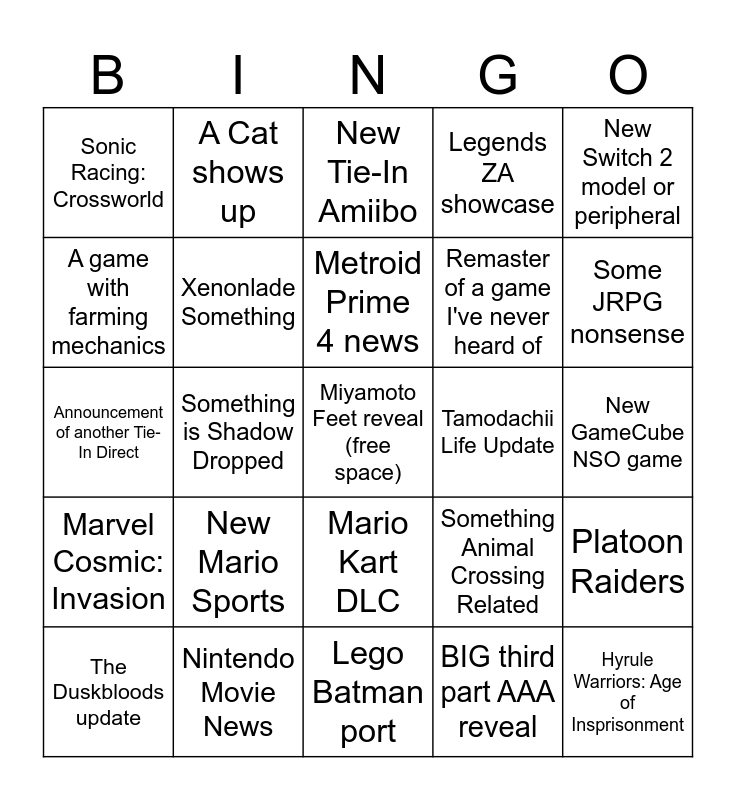 This bingo card has a free space and 24 words: New Mario Sports, Nintendo Movie News, Metroid Prime 4 news, The Duskbloods update, New Switch 2 model or peripheral, Sonic Racing: Crossworld, A game with farming mechanics, A Cat shows up, Tamodachii Life Update, Mario Kart DLC, Remaster of a game I've never heard of, Announcement of another Tie-In Direct, Something Animal Crossing Related, Platoon Raiders, Xenonlade Something, BIG third part AAA reveal, New GameCube NSO game, New Tie-In Amiibo, Some JRPG nonsense, Something is Shadow Dropped, Hyrule Warriors: Age of Insprisonment, Marvel Cosmic: Invasion, Legends ZA showcase and Lego Batman port.