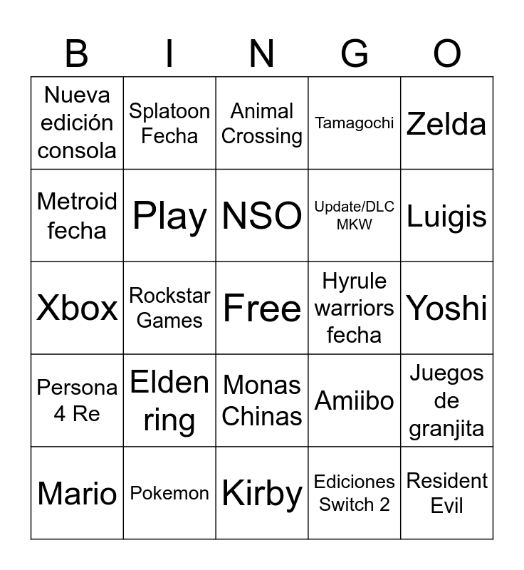 This bingo card has a free space and 24 words: Elden ring, Pokemon, NSO, Mario, Zelda, Nueva edición consola, Metroid fecha, Splatoon Fecha, Hyrule warriors fecha, Monas Chinas, Update/DLC MKW, Xbox, Amiibo, Juegos de granjita, Play, Ediciones Switch 2, Yoshi, Animal Crossing, Luigis, Rockstar Games, Resident Evil, Persona 4 Re, Tamagochi and Kirby.