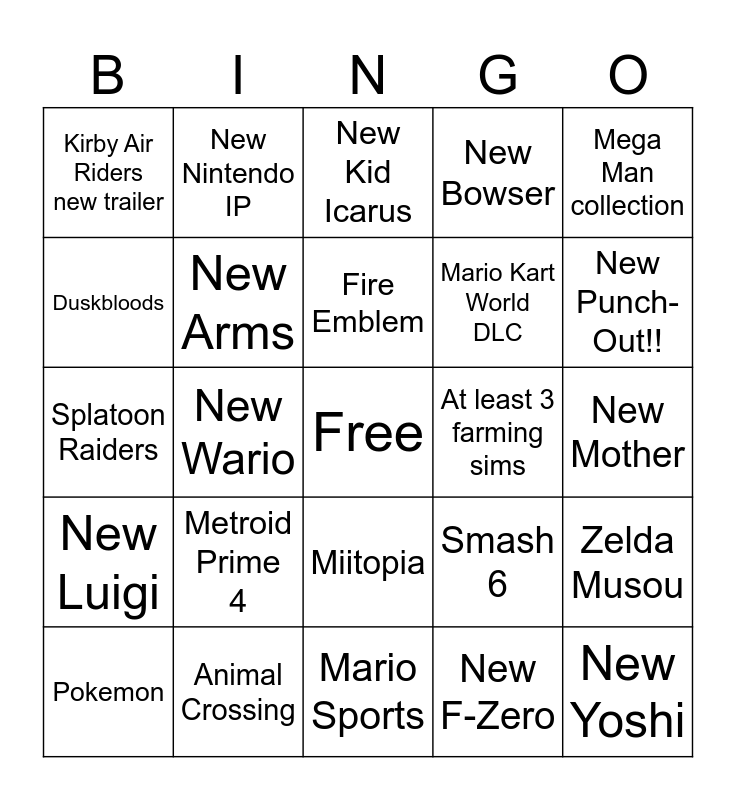 This bingo card has a free space and 24 words: Metroid Prime 4, Animal Crossing, Fire Emblem, Pokemon, Mega Man collection, Kirby Air Riders new trailer, Duskbloods, New Nintendo IP, At least 3 farming sims, Miitopia, Mario Kart World DLC, Splatoon Raiders, Smash 6, Zelda Musou, New Arms, New F-Zero, New Mother, New Kid Icarus, New Punch-Out!!, New Wario, New Yoshi, New Luigi, New Bowser and Mario Sports.