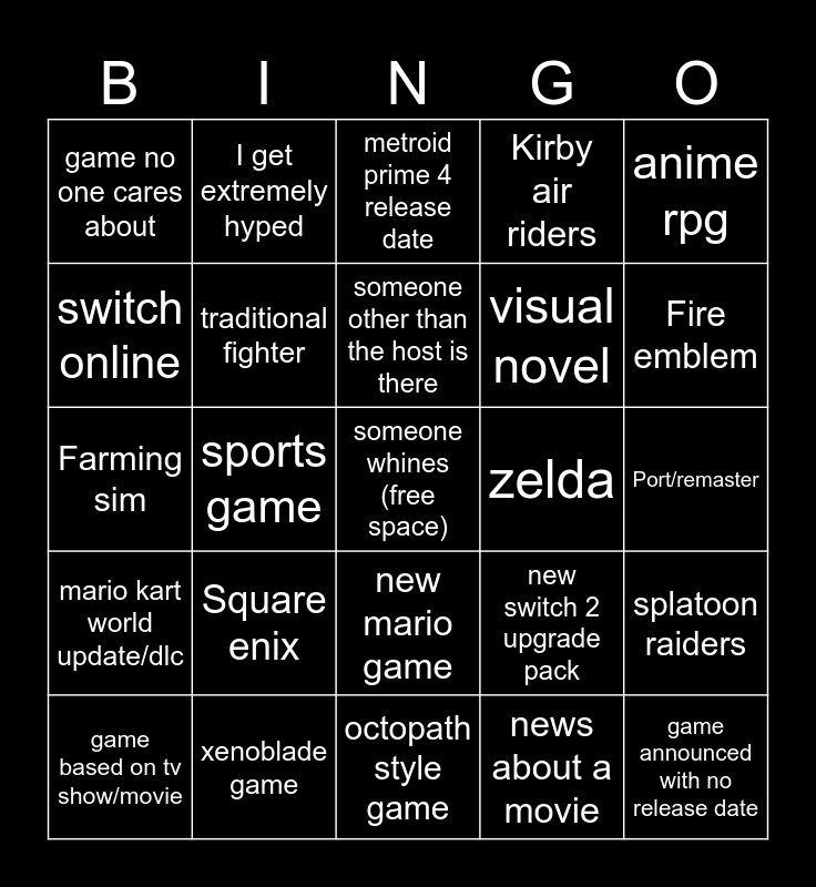 This bingo card has a free space and 24 words: Square enix, xenoblade game, someone other than the host is there, game based on tv show/movie, anime rpg, game no one cares about, switch online, I get extremely hyped, zelda, new mario game, visual novel, Farming sim, new switch 2 upgrade pack, splatoon raiders, traditional fighter, news about a movie, Port/remaster, metroid prime 4 release date, Fire emblem, sports game, game announced with no release date, mario kart world update/dlc, Kirby air riders and octopath style game.