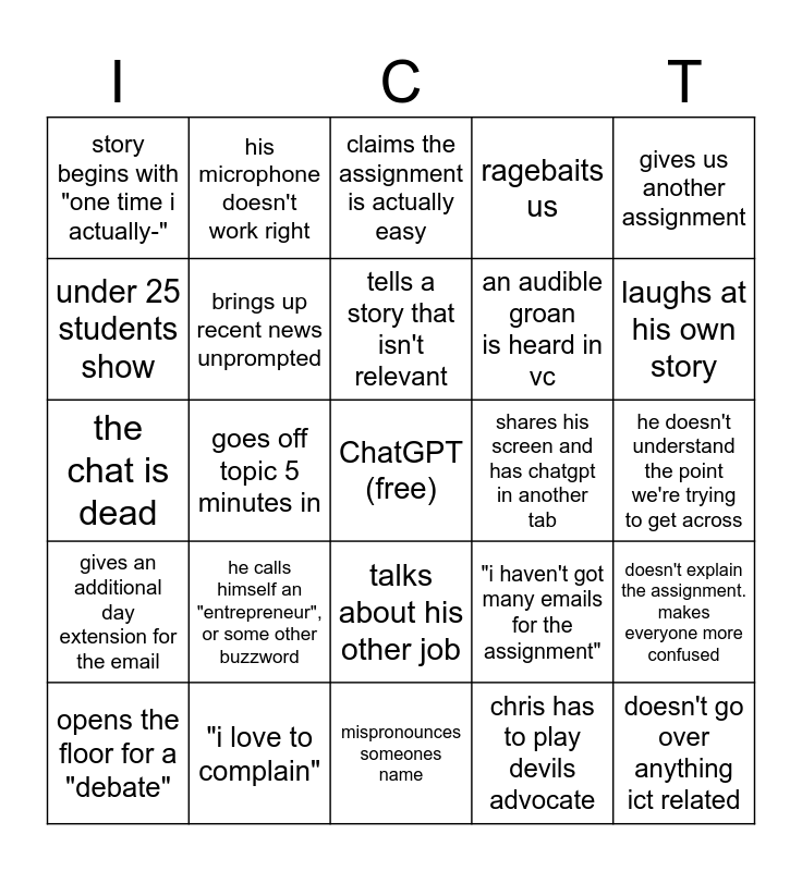 This bingo card has a free space and 24 words: he calls himself an "entrepreneur", or some other buzzword, "i love to complain", tells a story that isn't relevant, opens the floor for a "debate", gives us another assignment, story begins with "one time i actually-", under 25 students show, his microphone doesn't work right, shares his screen and has chatgpt in another tab, talks about his other job, an audible groan is heard in vc, the chat is dead, "i haven't got many emails for the assignment", doesn't explain the assignment. makes everyone more confused, brings up recent news unprompted, chris has to play devils advocate, he doesn't understand the point we're trying to get across, claims the assignment is actually easy, laughs at his own story, goes off topic 5 minutes in, doesn't go over anything ict related, gives an additional day extension for the email, ragebaits us and mispronounces someones name.