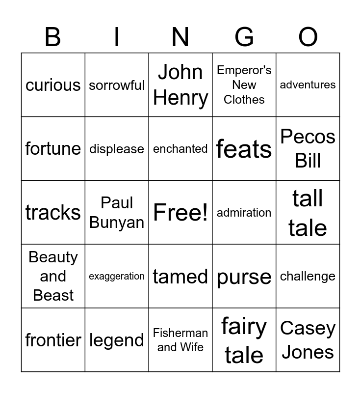 This bingo card has a free space and 24 words: exaggeration, legend, enchanted, frontier, adventures, curious, fortune, sorrowful, admiration, tamed, feats, tracks, purse, challenge, displease, fairy tale, tall tale, John Henry, Pecos Bill, Paul Bunyan, Casey Jones, Beauty and Beast, Emperor's New Clothes and Fisherman and Wife.