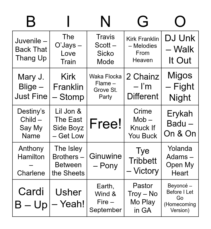 This bingo card has a free space and 51 words: Frankie Beverly & Maze – Before I Let Go, Beyoncé – Before I Let Go (Homecoming Version), Cameo – Candy, Earth, Wind & Fire – September, The Isley Brothers – Between the Sheets, Gap Band – Outstanding, The O’Jays – Love Train, Montell Jordan – This Is How We Do It, Mary J. Blige – Just Fine, OutKast – Hey Ya!, Kirk Franklin – Stomp, Kirk Franklin – Melodies From Heaven, Yolanda Adams – Open My Heart, Tye Tribbett – Victory, Hezekiah Walker – Every Praise, Swag Surfin’ – F.L.Y., Waka Flocka Flame – Grove St. Party, Crime Mob – Knuck If You Buck, Travis Porter – Bring It Back, DJ Unk – Walk It Out, Lil Jon & The East Side Boyz – Get Low, Pastor Troy – No Mo Play in GA, Juvenile – Back That Thang Up, 2 Chainz – I’m Different, Future – March Madness, Jay-Z & Kanye West – N**s in Paris, Migos – Fight Night, Megan Thee Stallion – Body, Cardi B – Up, Travis Scott – Sicko Mode, Drake – Started From the Bottom, Meek Mill – Dreams and Nightmares Intro, Nelly – Hot in Herre, Ying Yang Twins – Whisper Song, Soulja Boy – Crank That, Usher – Yeah!, Beyoncé – Crazy In Love, Alicia Keys – No One, Chris Brown – Forever, Brandy & Monica – The Boy Is Mine, Erykah Badu – On & On, Anthony Hamilton – Charlene, SWV – Weak, FREE, Bell Biv DeVoe – Poison, TLC – No Scrubs, Destiny’s Child – Say My Name, Ludacris – Move B**h*, Kanye West – Gold Digger, Ginuwine – Pony and Pharrell – Happy.