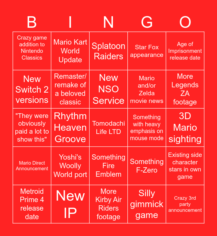 This bingo card has a free space and 24 words: Yoshi's Woolly World port, New IP, New NSO Service, Metroid Prime 4 release date, Age of Imprisonment release date, Crazy game addition to Nintendo Classics, New Switch 2 versions, Mario Kart World Update, Something with heavy emphasis on mouse mode, Something Fire Emblem, Mario and/or Zelda movie news, "They were obviously paid a lot to show this", Something F-Zero, Existing side character stars in own game, Remaster/ remake of a beloved classic, Silly gimmick game, 3D Mario sighting, Splatoon Raiders, More Legends ZA footage, Rhythm Heaven Groove, Crazy 3rd party announcement, Mario Direct Announcement, Star Fox appearance and More Kirby Air Riders footage.