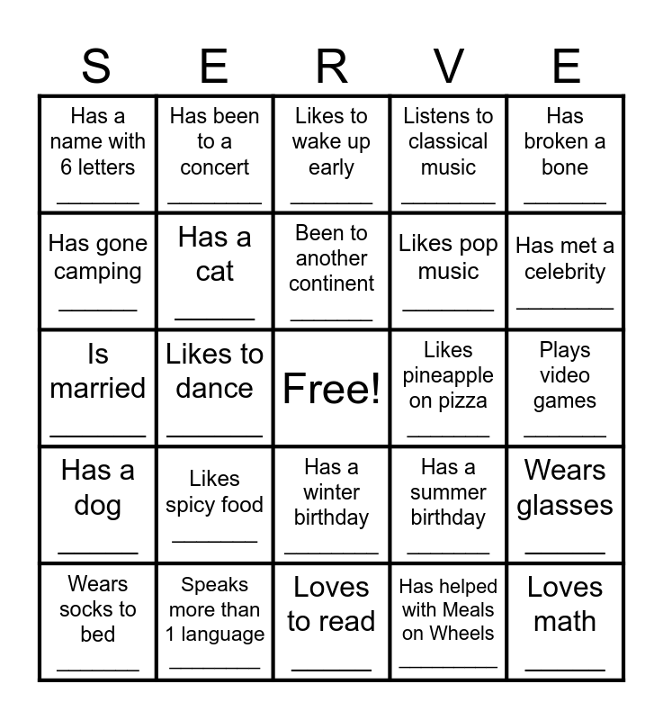 This bingo card has a free space and 34 words: Has more than two siblings ________, Has helped with Meals on Wheels _________, Plays an instrument ________, Has traveled out of the country _________, Has a dog _____, Has a cat _____, Has broken a bone _______, Wears socks to bed _______, Has been to a concert ________, Hates rollercoaster rides ________, Been to another continent _______, Likes to wake up early _______, Is a vegetarian ______, Is left handed ______, Likes pineapple on pizza _______, Has met a celebrity ________, Speaks more than 1 language ________, Is married ______, Likes spicy food _______, Has a summer birthday _______, Has a winter birthday ________, Likes sci-fi movies _______, Has a name with 6 letters _______, Plays video games _______, Loves to read _____, Loves math _____, Listens to classical music ________, Listens to Jazz music ________, Likes pop music _______, Has gone camping ______, Is an only child _______, Likes to dance ______, Wears glasses _____ and Likes to cook ______.