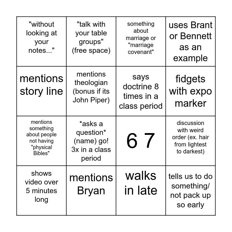 This bingo card has 16 words: mentions Bryan, discussion with weird order (ex. hair from lightest to darkest), something about marriage or "marriage covenant", "without looking at your notes...", mentions something about people not having "physical Bibles", "talk with your table groups" (free space), 6 7, walks in late, mentions story line, mentions theologian (bonus if its John Piper), shows video over 5 minutes long, uses Brant or Bennett as an example, *asks a question* (name) go! 3x in a class period, fidgets with expo marker, says doctrine 8 times in a class period and tells us to do something/ not pack up so early.