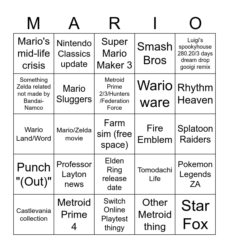 This bingo card has a free space and 24 words: Professor Layton news, Metroid Prime 4, Metroid Prime 2/3/Hunters /Federation Force, Castlevania collection, Luigi's spookyhouse 280.20/3 days dream drop gooigi remix, Mario's mid-life crisis, Something Zelda related not made by Bandai-Namco, Nintendo Classics update, Fire Emblem, Elden Ring release date, Wario ware, Wario Land/Word, Tomodachi Life, Pokemon Legends ZA, Mario Sluggers, Other Metroid thing, Splatoon Raiders, Super Mario Maker 3, Rhythm Heaven, Mario/Zelda movie, Star Fox, Punch "(Out)", Smash Bros and Switch Online Playtest thingy.