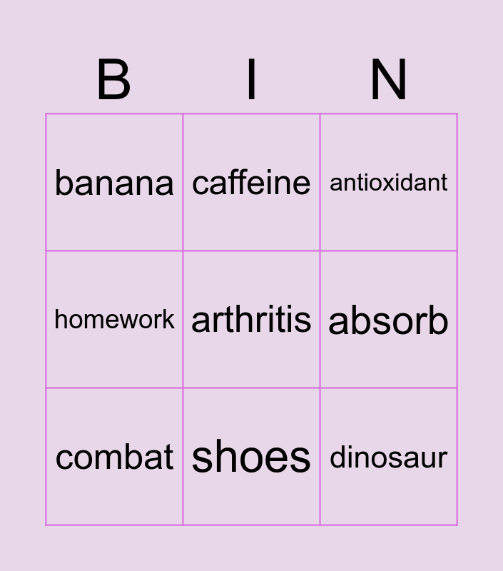 This bingo card has a free space and 8 words: absorb, antioxidant, caffeine, combat, banana, dinosaur, homework and shoes.