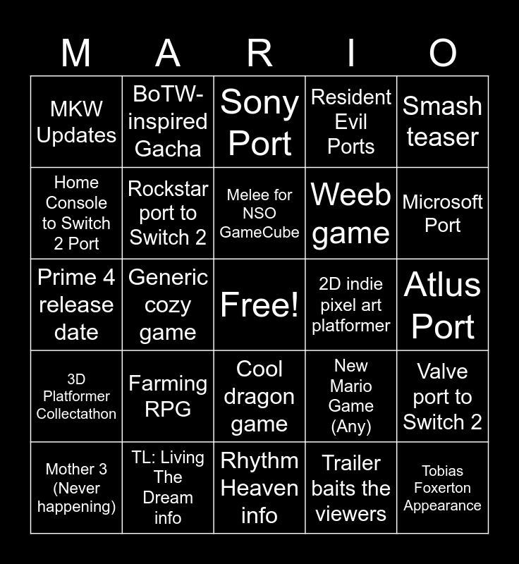 This bingo card has a free space and 24 words: Farming RPG, TL: Living The Dream info, Melee for NSO GameCube, Mother 3 (Never happening), Smash teaser, MKW Updates, Home Console to Switch 2 Port, BoTW-inspired Gacha, 2D indie pixel art platformer, Cool dragon game, Weeb game, Prime 4 release date, New Mario Game (Any), Valve port to Switch 2, Rockstar port to Switch 2, Trailer baits the viewers, Atlus Port, Sony Port, Microsoft Port, Generic cozy game, Tobias Foxerton Appearance, 3D Platformer Collectathon, Resident Evil Ports and Rhythm Heaven info.