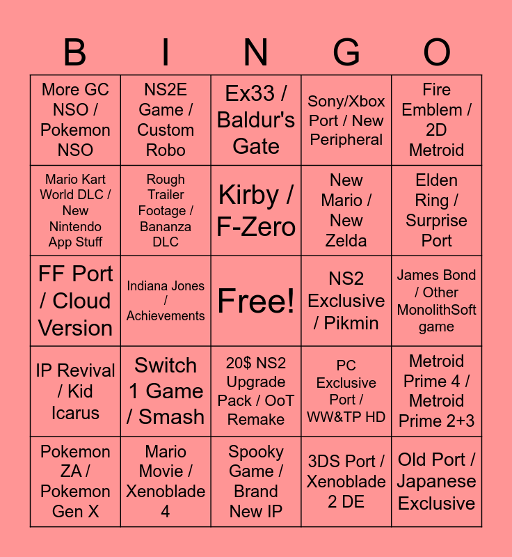 This bingo card has a free space and 24 words: Switch 1 Game / Smash, Mario Movie / Xenoblade 4, Kirby / F-Zero, Pokemon ZA / Pokemon Gen X, Fire Emblem / 2D Metroid, More GC NSO / Pokemon NSO, Mario Kart World DLC / New Nintendo App Stuff, NS2E Game / Custom Robo, NS2 Exclusive / Pikmin, 20$ NS2 Upgrade Pack / OoT Remake, New Mario / New Zelda, FF Port / Cloud Version, PC Exclusive Port / WW&TP HD, Metroid Prime 4 / Metroid Prime 2+3, Rough Trailer Footage / Bananza DLC, 3DS Port / Xenoblade 2 DE, James Bond / Other MonolithSoft game, Ex33 / Baldur's Gate, Elden Ring / Surprise Port, Indiana Jones / Achievements, Old Port / Japanese Exclusive, IP Revival / Kid Icarus, Sony/Xbox Port / New Peripheral and Spooky Game / Brand New IP.
