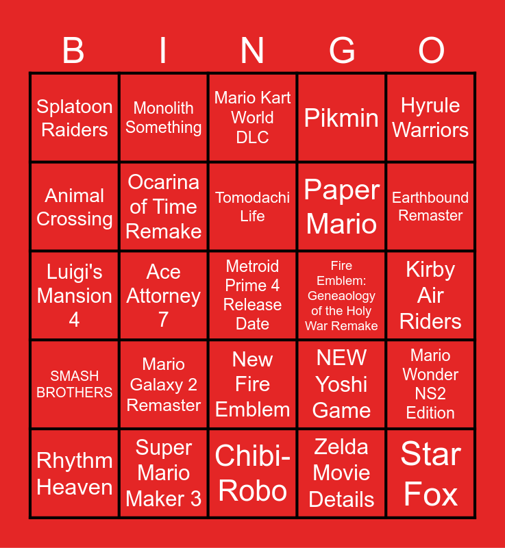 This bingo card has a free space and 24 words: Mario Galaxy 2 Remaster, Super Mario Maker 3, Tomodachi Life, Rhythm Heaven, Hyrule Warriors, Splatoon Raiders, Animal Crossing, Monolith Something, Fire Emblem: Geneaology of the Holy War Remake, New Fire Emblem, Paper Mario, Luigi's Mansion 4, NEW Yoshi Game, Mario Wonder NS2 Edition, Ocarina of Time Remake, Zelda Movie Details, Kirby Air Riders, Mario Kart World DLC, Earthbound Remaster, Ace Attorney 7, Star Fox, SMASH BROTHERS, Pikmin and Chibi-Robo.