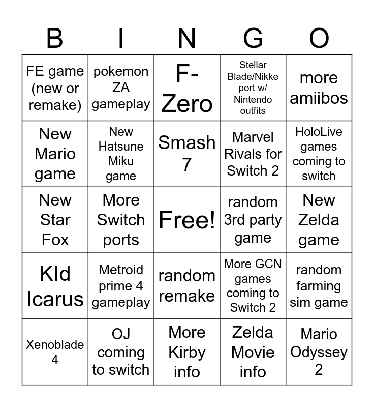 This bingo card has a free space and 24 words: Metroid prime 4 gameplay, OJ coming to switch, Smash 7, Xenoblade 4, more amiibos, FE game (new or remake), New Mario game, pokemon ZA gameplay, random 3rd party game, random remake, Marvel Rivals for Switch 2, New Star Fox, More GCN games coming to Switch 2, random farming sim game, New Hatsune Miku game, Zelda Movie info, New Zelda game, F-Zero, HoloLive games coming to switch, More Switch ports, Mario Odyssey 2, KId Icarus, Stellar Blade/Nikke port w/ Nintendo outfits and More Kirby info.