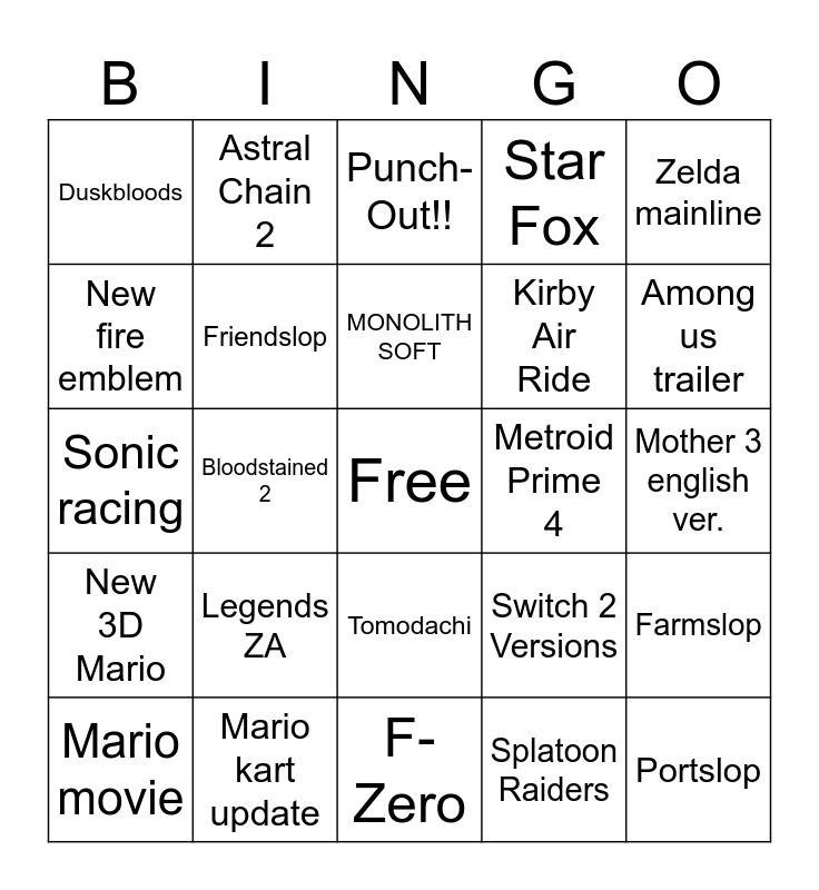 This bingo card has a free space and 24 words: Legends ZA, Mario kart update, MONOLITH SOFT, Mario movie, Zelda mainline, Duskbloods, New fire emblem, Astral Chain 2, Metroid Prime 4, Tomodachi, Kirby Air Ride, Sonic racing, Switch 2 Versions, Farmslop, Friendslop, Splatoon Raiders, Mother 3 english ver., Punch-Out!!, Among us trailer, Bloodstained 2, Portslop, New 3D Mario, Star Fox and F-Zero.