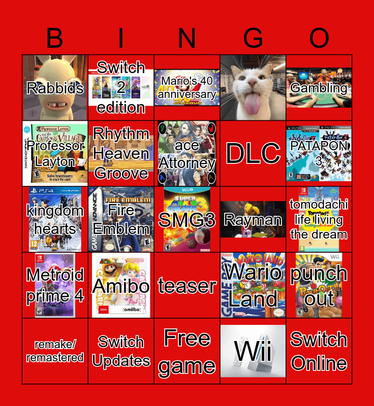 This bingo card has 18 images, a free space and 23 words: Amibo, Switch Updates, ace Attorney, remake/ remastered, Gambling, Rabbids, Professor Layton, Switch 2 edition, Rayman, teaser, DLC, kingdom hearts, Wario Land, punch out, Rhythm Heaven Groove, Wii, tomodachi life living the dream, Mario's 40 anniversary, PATAPON 3, Fire Emblem, Switch Online, Metroid prime 4 and Free game.