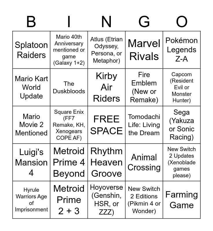 This bingo card has a free space and 24 words: Metroid Prime 4 Beyond, Metroid Prime 2 + 3, Kirby Air Riders, Hyrule Warriors Age of Imprisonment, Pokémon Legends Z-A, Splatoon Raiders, Mario Kart World Update, Mario 40th Anniversary mentioned or game (Galaxy 1+2), Tomodachi Life: Living the Dream, Rhythm Heaven Groove, Fire Emblem (New or Remake), Mario Movie 2 Mentioned, Animal Crossing, New Switch 2 Updates (Xenoblade games please), The Duskbloods, New Switch 2 Editions (Pikmin 4 or Wonder), Sega (Yakuza or Sonic Racing), Atlus (Etrian Odyssey, Persona, or Metaphor), Capcom (Resident Evil or Monster Hunter), Square Enix (FF7 Remake, KH, Xenogears COPE AF), Farming Game, Luigi's Mansion 4, Marvel Rivals and Hoyoverse (Genshin, HSR, or ZZZ).