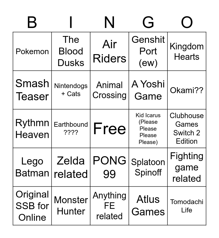 This bingo card has a free space and 24 words: Zelda related, Monster Hunter, Animal Crossing, Original SSB for Online, Kingdom Hearts, Pokemon, Smash Teaser, The Blood Dusks, Kid Icarus (Please Please Please Please), PONG 99, A Yoshi Game, Rythmn Heaven, Splatoon Spinoff, Fighting game related, Nintendogs + Cats, Atlus Games, Clubhouse Games Switch 2 Edition, Air Riders, Okami??, Earthbound ????, Tomodachi Life, Lego Batman, Genshit Port (ew) and Anything FE related.