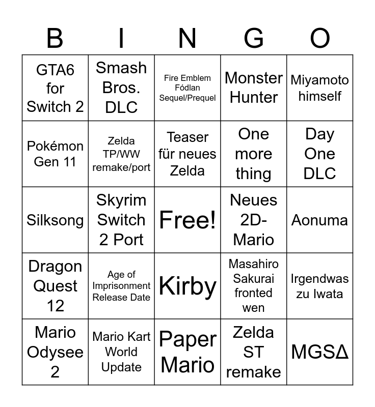 This bingo card has a free space and 24 words: Age of Imprisonment Release Date, Mario Kart World Update, Teaser für neues Zelda, Mario Odysee 2, Miyamoto himself, GTA6 for Switch 2, Pokémon Gen 11, Smash Bros. DLC, Neues 2D-Mario, Kirby, One more thing, Silksong, Masahiro Sakurai fronted wen, Irgendwas zu Iwata, Zelda TP/WW remake/port, Zelda ST remake, Aonuma, Fire Emblem Fódlan Sequel/Prequel, Day One DLC, Skyrim Switch 2 Port, MGSΔ, Dragon Quest 12, Monster Hunter and Paper Mario.