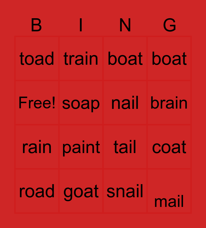This bingo card has 16 words: goat, coat, boat, toad, rain, train, tail, snail, Free!, soap, road, boat, paint, brain, nail and mail.
