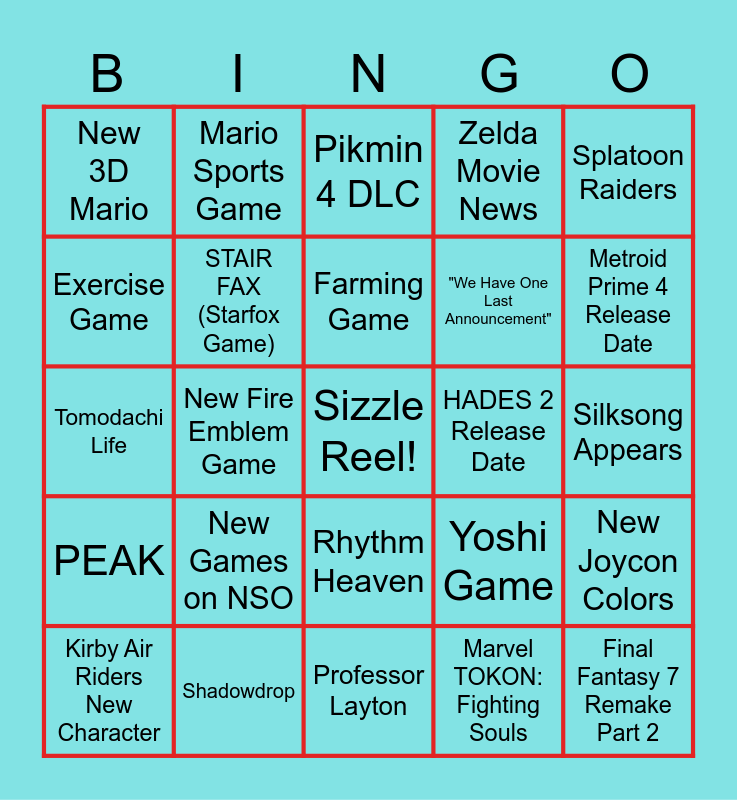 This bingo card has a free space and 29 words: Kirby Air Riders New Character, New 2D Mario, New Fire Emblem Game, New Zelda Game, New 3D Mario, Pikmin 4 DLC, STAIR FAX (Starfox Game), New Games on NSO, HADES 2 Release Date, Shadowdrop, Silksong Appears, Final Fantasy 7 Remake Part 2, Professor Layton, Marvel TOKON: Fighting Souls, Metroid Prime 4 Release Date, Pokemon Z-A appears again, Rhythm Heaven, PEAK, Splatoon Raiders, Tomodachi Life, Yoshi Game, Twilight Princess / Wind Waker, "We Have One Last Announcement", Exercise Game, Zelda Movie News, Mario Sports Game, New Joycon Colors, Farming Game and Animal Crossing.