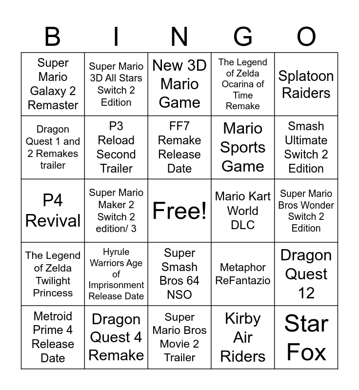 This bingo card has a free space and 24 words: Metroid Prime 4 Release Date, Hyrule Warriors Age of Imprisonment Release Date, FF7 Remake Release Date, Kirby Air Riders, Splatoon Raiders, Super Mario Galaxy 2 Remaster, Super Mario 3D All Stars Switch 2 Edition, New 3D Mario Game, Mario Kart World DLC, Super Mario Bros Wonder Switch 2 Edition, P4 Revival, P3 Reload Second Trailer, Metaphor ReFantazio, Dragon Quest 12, Dragon Quest 1 and 2 Remakes trailer, Dragon Quest 4 Remake, Super Mario Bros Movie 2 Trailer, The Legend of Zelda Ocarina of Time Remake, Smash Ultimate Switch 2 Edition, The Legend of Zelda Twilight Princess, Super Mario Maker 2 Switch 2 edition/ 3, Super Smash Bros 64 NSO, Mario Sports Game and Star Fox.