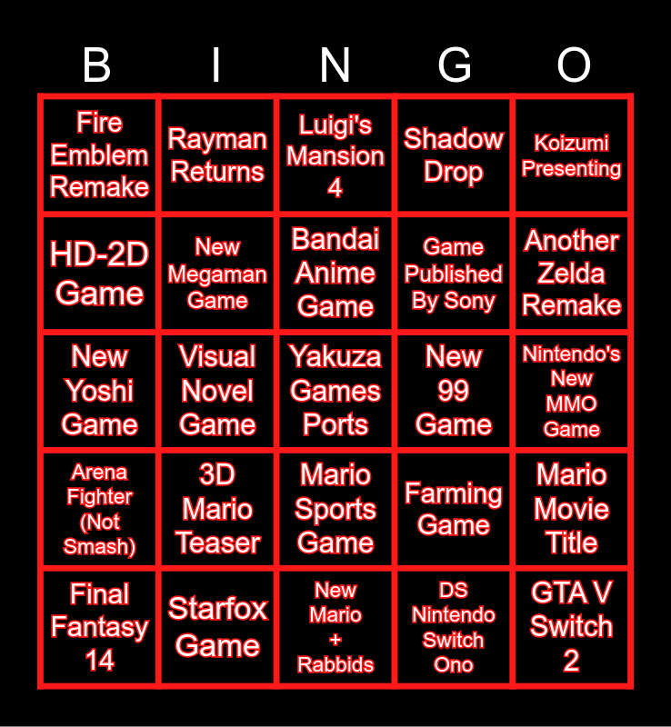 This bingo card has 25 words: 3D Mario Teaser, New Mario + Rabbids, Bandai Anime Game, Final Fantasy 14, Koizumi Presenting, Fire Emblem Remake, HD-2D Game, Rayman Returns, New 99 Game, Mario Sports Game, Game Published By Sony, New Yoshi Game, Farming Game, Mario Movie Title, New Megaman Game, GTA V Switch 2, Nintendo's New MMO Game, Luigi's Mansion 4, Another Zelda Remake, Visual Novel Game, Yakuza Games Ports, Starfox Game, Arena Fighter (Not Smash), Shadow Drop and DS Nintendo Switch Ono.
