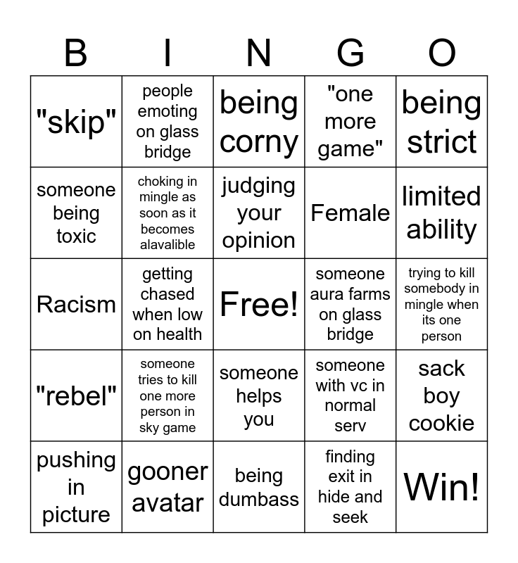 This bingo card has a free space and 24 words: someone tries to kill one more person in sky game, gooner avatar, judging your opinion, pushing in picture, being strict, "skip", someone being toxic, people emoting on glass bridge, someone aura farms on glass bridge, someone helps you, Female, Racism, someone with vc in normal serv, sack boy cookie, choking in mingle as soon as it becomes alavalible, finding exit in hide and seek, trying to kill somebody in mingle when its one person, being corny, limited ability, getting chased when low on health, Win!, "rebel", "one more game" and being dumbass.
