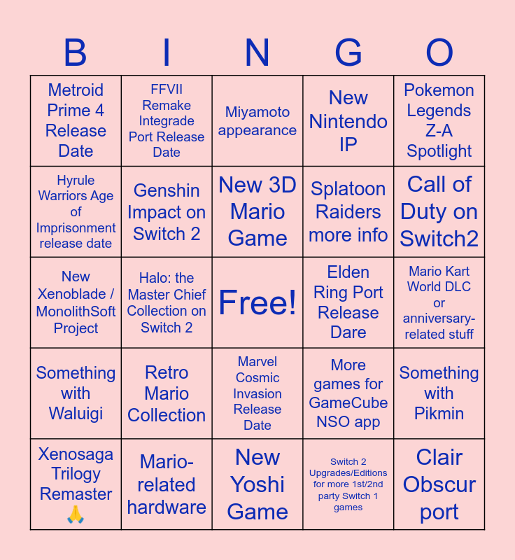 This bingo card has a free space and 24 words: Retro Mario Collection, Mario-related hardware, New 3D Mario Game, Xenosaga Trilogy Remaster 🙏, Pokemon Legends Z-A Spotlight, Metroid Prime 4 Release Date, Hyrule Warriors Age of Imprisonment release date, FFVII Remake Integrade Port Release Date, Elden Ring Port Release Dare, Marvel Cosmic Invasion Release Date, Splatoon Raiders more info, New Xenoblade / MonolithSoft Project, More games for GameCube NSO app, Something with Pikmin, Genshin Impact on Switch 2, Switch 2 Upgrades/Editions for more 1st/2nd party Switch 1 games, Mario Kart World DLC or anniversary-related stuff, Miyamoto appearance, Call of Duty on Switch2, Halo: the Master Chief Collection on Switch 2, Clair Obscur port, Something with Waluigi, New Nintendo IP and New Yoshi Game.