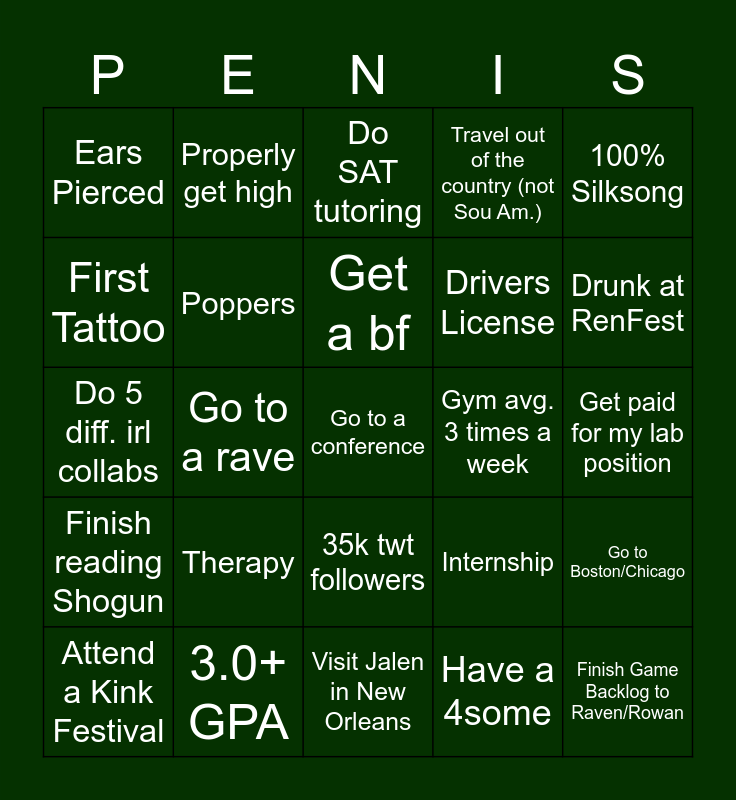 This bingo card has a free space and 24 words: Therapy, 3.0+ GPA, Get a bf, Attend a Kink Festival, 100% Silksong, Ears Pierced, First Tattoo, Properly get high, Gym avg. 3 times a week, 35k twt followers, Drivers License, Do 5 diff. irl collabs, Internship, Go to Boston/Chicago, Poppers, Have a 4some, Get paid for my lab position, Do SAT tutoring, Drunk at RenFest, Go to a rave, Finish Game Backlog to Raven/Rowan, Finish reading Shogun, Travel out of the country (not Sou Am.) and Visit Jalen in New Orleans.