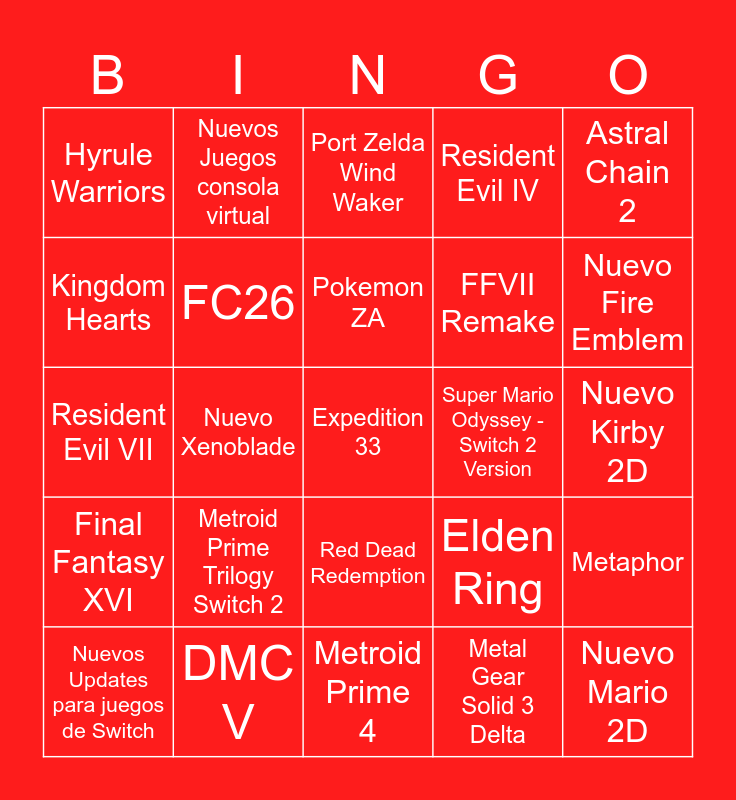 This bingo card has 25 words: Metroid Prime Trilogy Switch 2, Metroid Prime 4, Pokemon ZA, Nuevos Updates para juegos de Switch, Astral Chain 2, Hyrule Warriors, Kingdom Hearts, Nuevos Juegos consola virtual, Super Mario Odyssey - Switch 2 Version, Red Dead Redemption, FFVII Remake, Resident Evil VII, Elden Ring, Metaphor, FC26, Nuevo Mario 2D, Nuevo Kirby 2D, Port Zelda Wind Waker, Nuevo Fire Emblem, Nuevo Xenoblade, Expedition 33, DMC V, Final Fantasy XVI, Resident Evil IV and Metal Gear Solid 3 Delta.