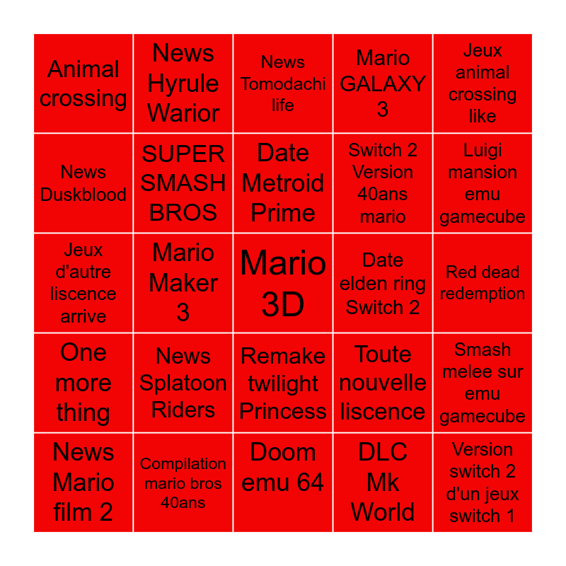 This bingo card has a free space and 24 words: News Mario film 2, News Splatoon Riders, Date Metroid Prime, DLC Mk World, Jeux animal crossing like, Animal crossing, News Hyrule Warior, News Tomodachi life, Date elden ring Switch 2, Red dead redemption, Jeux d'autre liscence arrive, SUPER SMASH BROS, Toute nouvelle liscence, Smash melee sur emu gamecube, News Duskblood, Compilation mario bros 40ans, Doom emu 64, Mario GALAXY 3, Luigi mansion emu gamecube, One more thing, Mario Maker 3, Remake twilight Princess, Switch 2 Version 40ans mario and Version switch 2 d'un jeux switch 1.