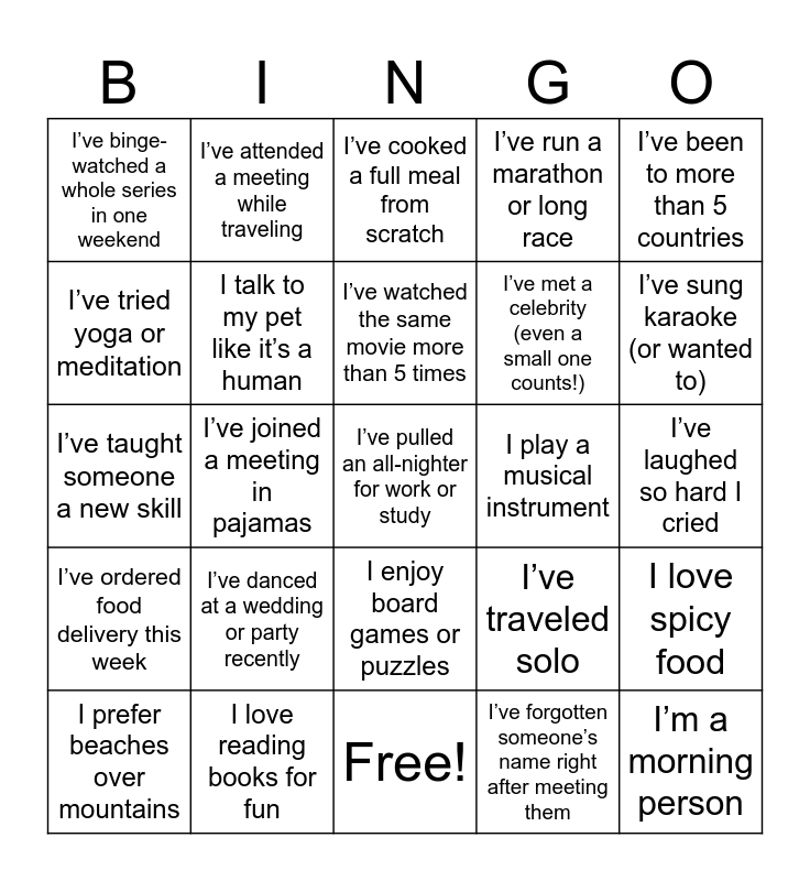 This bingo card has 31 words: Free!, I love chai more than coffee, I’ve joined a meeting in pajamas, I can speak more than 2 languages, I’ve binge-watched a whole series in one weekend, I’ve cooked a full meal from scratch, I talk to my pet like it’s a human, I’ve traveled solo, I play a musical instrument, I’ve forgotten someone’s name right after meeting them, I’ve laughed so hard I cried, I’ve pulled an all-nighter for work or study, I’m a morning person, I’m a night owl, I’ve sung karaoke (or wanted to), I’ve accidentally sent a message to the wrong group, I love spicy food, I’ve danced at a wedding or party recently, I’ve ordered food delivery this week, I enjoy board games or puzzles, I’ve been to more than 5 countries, I prefer mountains over beaches, I prefer beaches over mountains, I’ve attended a meeting while traveling, I’ve met a celebrity (even a small one counts!), I’ve tried yoga or meditation, I’ve run a marathon or long race, I’ve taught someone a new skill, I love reading books for fun, I’ve watched the same movie more than 5 times and I enjoy cooking more than eating out.