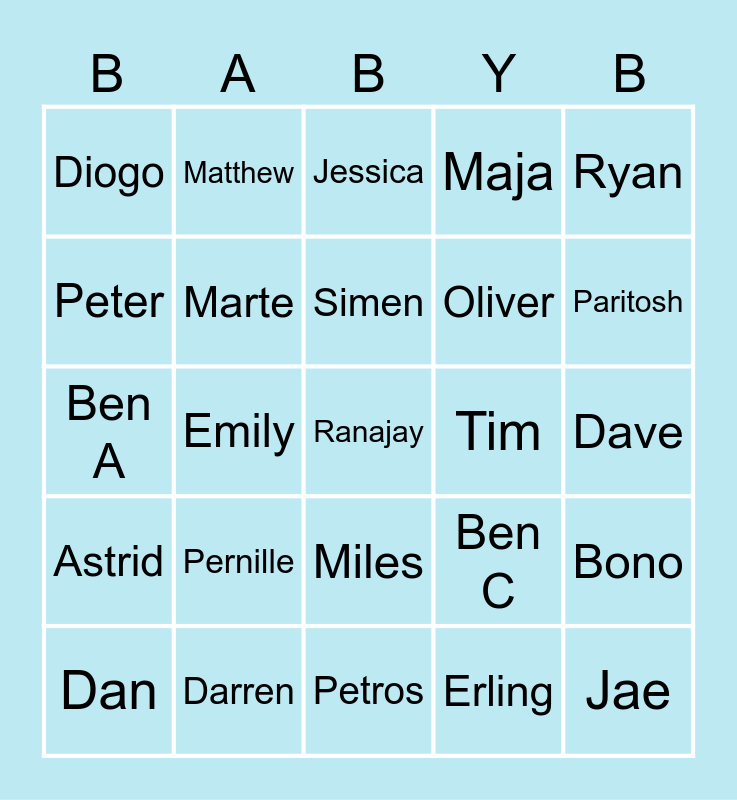 This bingo card has a free space and 37 words: Nellie, Dipesh, Sarah, Marte, Bono, Pernille, Simen, Christoffer, Ryan, Rakhshanda, Emily, Maja, Jae, Dave, Peter, Astrid, Tollef, Jessica, Miles, Tim, Diogo, Paritosh, Dan, Petros, Nico, Erling, Matthew, Paul, Jon, Erfan, Josh, Darren, Ben A, AC, Ben C, Oliver and Oscar.