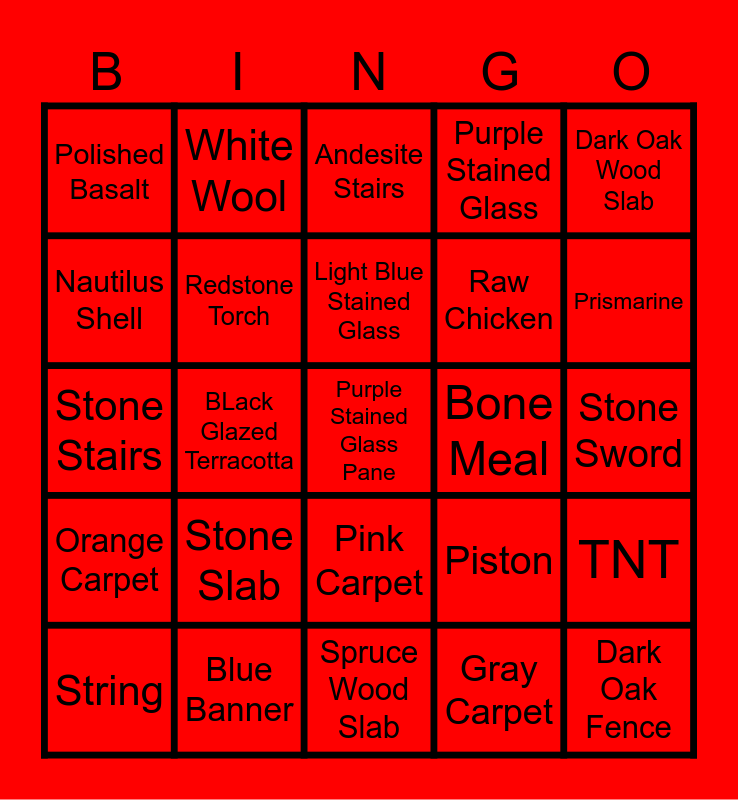 This bingo card has a free space and 24 words: Stone Slab, Blue Banner, Light Blue Stained Glass, String, Dark Oak Wood Slab, Polished Basalt, Nautilus Shell, White Wool, Bone Meal, Pink Carpet, Raw Chicken, Stone Stairs, Piston, TNT, Redstone Torch, Gray Carpet, Stone Sword, Andesite Stairs, Prismarine, BLack Glazed Terracotta, Dark Oak Fence, Orange Carpet, Purple Stained Glass and Spruce Wood Slab.