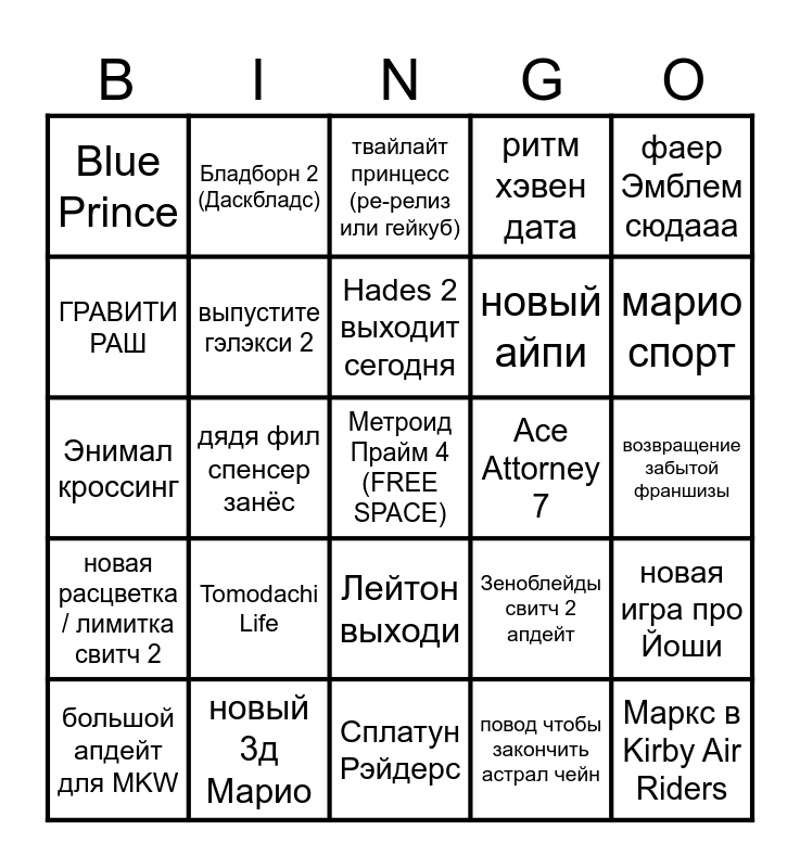 This bingo card has a free space and 24 words: Tomodachi Life, новый 3д Марио, Hades 2 выходит сегодня, большой апдейт для MKW, фаер Эмблем сюдааа, Blue Prince, ГРАВИТИ РАШ, Бладборн 2 (Даскбладс), Ace Attorney 7, Лейтон выходи, новый айпи, Энимал кроссинг, Зеноблейды свитч 2 апдейт, новая игра про Йоши, выпустите гэлэкси 2, повод чтобы закончить астрал чейн, возвращение забытой франшизы, твайлайт принцесс (ре-релиз или гейкуб), марио спорт, дядя фил спенсер занёс, Маркс в Kirby Air Riders, новая расцветка / лимитка свитч 2, ритм хэвен дата and Сплатун Рэйдерс.