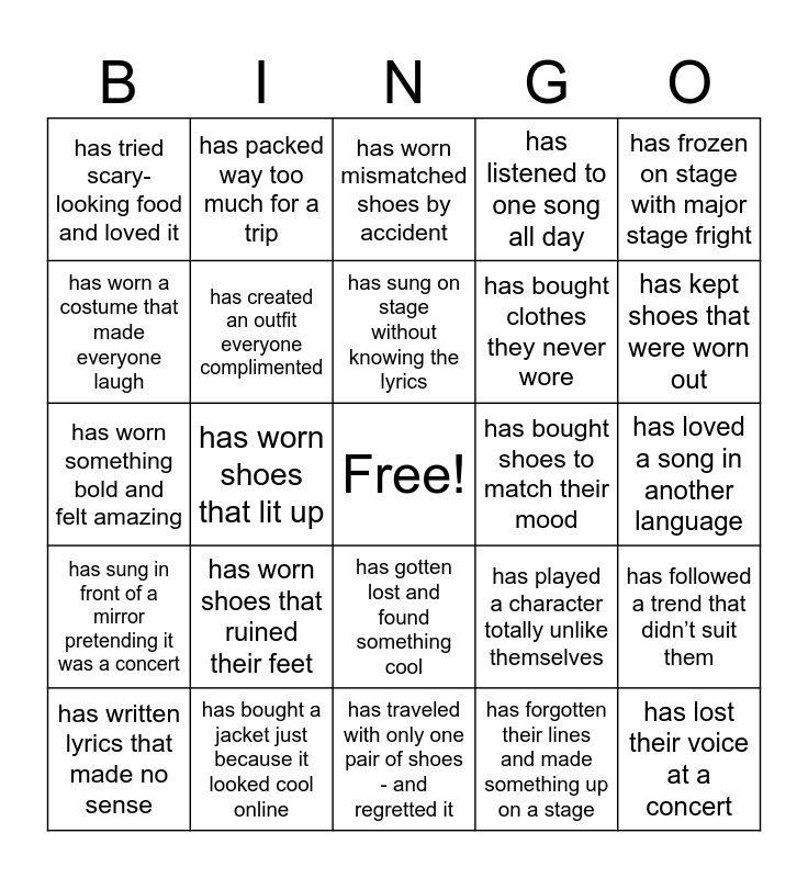 This bingo card has a free space and 24 words: has worn shoes that ruined their feet, has bought a jacket just because it looked cool online, has sung on stage without knowing the lyrics, has written lyrics that made no sense, has frozen on stage with major stage fright, has tried scary-looking food and loved it, has worn a costume that made everyone laugh, has packed way too much for a trip, has bought shoes to match their mood, has gotten lost and found something cool, has bought clothes they never wore, has worn something bold and felt amazing, has played a character totally unlike themselves, has followed a trend that didn’t suit them, has created an outfit everyone complimented, has forgotten their lines and made something up on a stage, has loved a song in another language, has worn mismatched shoes by accident, has kept shoes that were worn out, has worn shoes that lit up, has lost their voice at a concert, has sung in front of a mirror pretending it was a concert, has listened to one song all day and has traveled with only one pair of shoes - and regretted it.