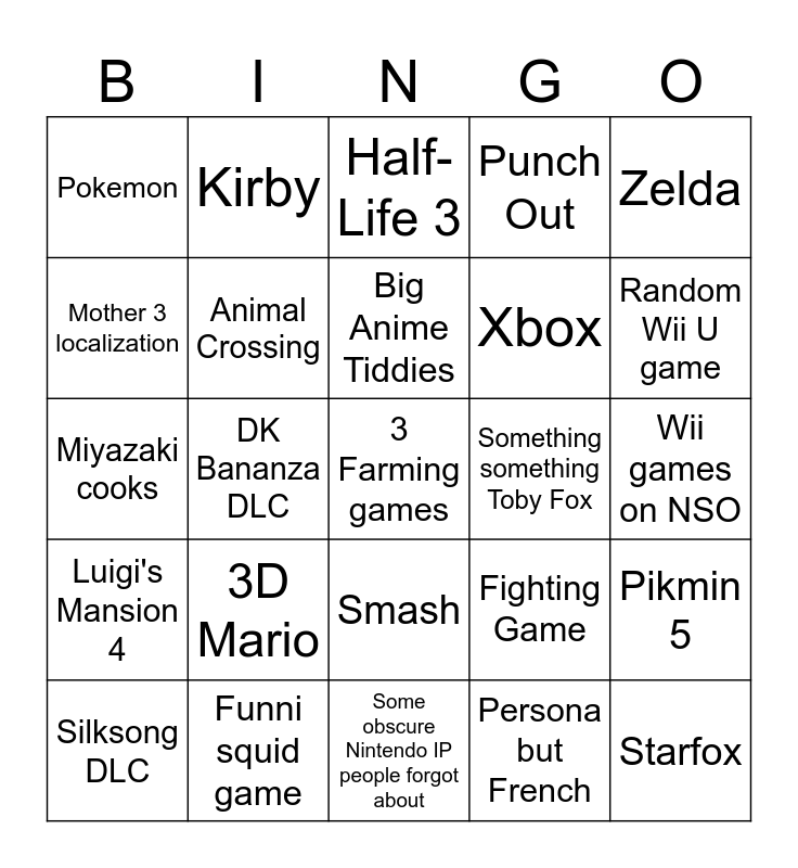 This bingo card has a free space and 24 words: 3D Mario, Funni squid game, Big Anime Tiddies, Silksong DLC, Zelda, Pokemon, Mother 3 localization, Kirby, Something something Toby Fox, Smash, Xbox, Miyazaki cooks, Fighting Game, Pikmin 5, Animal Crossing, Persona but French, Wii games on NSO, Half-Life 3, Random Wii U game, DK Bananza DLC, Starfox, Luigi's Mansion 4, Punch Out and Some obscure Nintendo IP people forgot about.