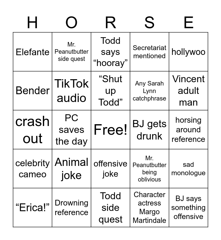 This bingo card has a free space and 24 words: “Erica!”, Animal joke, “Shut up Todd”, Character actress Margo Martindale, hollywoo, Elefante, Mr. Peanutbutter side quest, Todd says “hooray”, BJ gets drunk, horsing around reference, crash out, TikTok audio, Mr. Peanutbutter being oblivious, sad monologue, Bender, Drowning reference, Todd side quest, Secretariat mentioned, Vincent adult man, celebrity cameo, PC saves the day, offensive joke, Any Sarah Lynn catchphrase and BJ says something offensive.