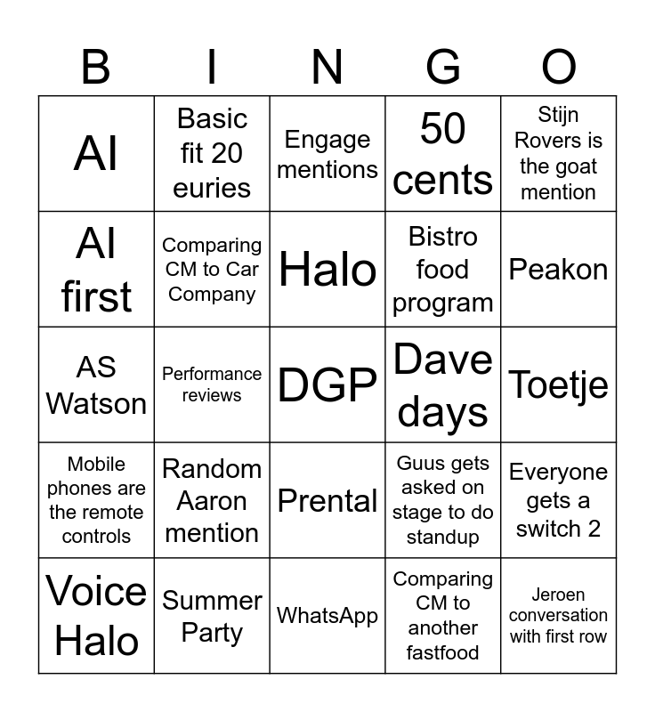 This bingo card has a free space and 24 words: Random Aaron mention, Summer Party, Halo, Voice Halo, Stijn Rovers is the goat mention, AI, AI first, Basic fit 20 euries, Dave days, Prental, Bistro food program, AS Watson, Guus gets asked on stage to do standup, Everyone gets a switch 2, Comparing CM to Car Company, Comparing CM to another fastfood, Toetje, Engage mentions, Peakon, Performance reviews, Jeroen conversation with first row, Mobile phones are the remote controls, 50 cents and WhatsApp.