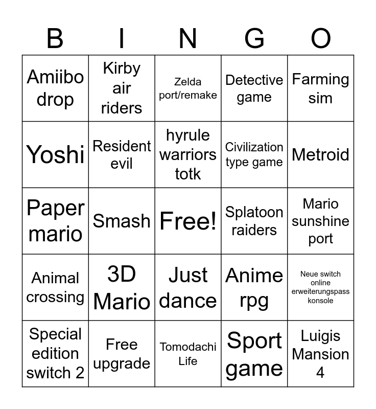 This bingo card has a free space and 24 words: 3D Mario, Free upgrade, hyrule warriors totk, Special edition switch 2, Farming sim, Amiibo drop, Yoshi, Kirby air riders, Splatoon raiders, Just dance, Civilization type game, Paper mario, Anime rpg, Neue switch online erweiterungspass konsole, Resident evil, Sport game, Mario sunshine port, Zelda port/remake, Metroid, Smash, Luigis Mansion 4, Animal crossing, Detective game and Tomodachi Life.