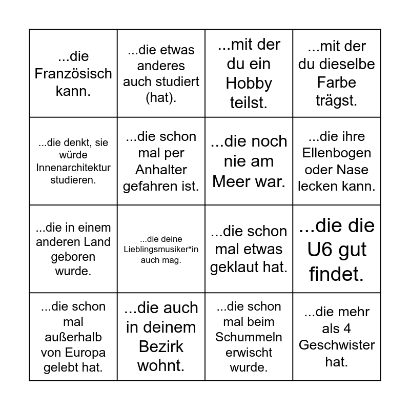 This bingo card has 16 words: ...die auch in deinem Bezirk wohnt., ...die die U6 gut findet., ...mit der du ein Hobby teilst., ...die Französisch kann., ...die in einem anderen Land geboren wurde., ...die etwas anderes auch studiert (hat)., ...die schon mal etwas geklaut hat., ...die schon mal beim Schummeln erwischt wurde., ...die denkt, sie würde Innenarchitektur studieren., ...die schon mal per Anhalter gefahren ist., ...die schon mal außerhalb von Europa gelebt hat., ...mit der du dieselbe Farbe trägst., ...die deine Lieblingsmusiker*in auch mag., ...die ihre Ellenbogen oder Nase lecken kann., ...die noch nie am Meer war. and ...die mehr als 4 Geschwister hat..