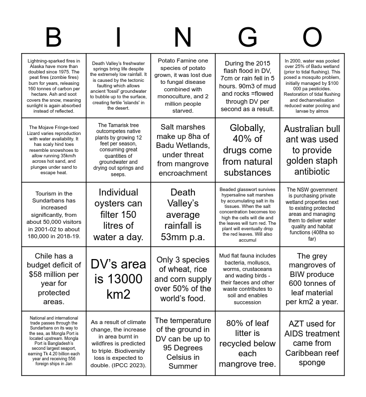 This bingo card has 50 words: Free!, Death Valley’s average rainfall is 53mm p.a., Death Valley’s average summer maximum temperature is 46.6 Degrees Celsius, The temperature of the ground in DV can be up to 95 Degrees Celsius in Summer, DV’s area is 13000 km2, The Devil’s Hole Pupfish has adapted to extremely warm (40+ degrees) and hypersaline water (2.5x saltier than seawater), Death Valley’s freshwater springs bring life despite the extremely low rainfall. It is caused by the tectonic faulting which allows ancient 'fossil' groundwater to bubble up to the surface, creating fertile 'islands' in the desert., Burros over-browse vegetation, eating 3 tonnes p.a., and aggressively keep native animals away from springs., The Mojave Fringe-toed Lizard varies reproduction with water availability. It has scaly hind toes resemble snowshoes to allow running 35km/h across hot sand, and plunges under sand to escape heat., The Mesquite tree has a 25m tap root system enabling it to access the deep ground water, The Tamarisk tree outcompetes native plants by growing 12 feet per season, consuming great quantities of groundwater and drying out springs and seeps., During the 2015 flash flood in DV, 7cm or rain fell in 5 hours. 90m3 of mud and rocks =flowed through DV per second as a result., The grey mangroves of BIW produce 600 tonnes of leaf material per km2 a year., Mud flat fauna includes bacteria, molluscs, worms, crustaceans and wading birds - their faeces and other waste contributes to soil and enables succession, Pneumatophores allow roots to survive anoxic soils. Can exist under the higher tidal waters for a short time using gases previously stored in the tissue of the root. This can fail if inundation pattern is changed., Mangroves make up 40ha of Badu Wetlands today (was down to 9.8ha in 1978); also invading other areas (seeds float and are deposited elsewhere by the tide) but being kept under control., Salt marshes make up 8ha of Badu Wetlands, under threat from mangrove encroachment, Beaded glasswort survives hypersaline salt marshes by accumulating salt in its tissues. When the salt concentration becomes too high the cells will die and the leaves will turn red. The plant will eventually drop the red leaves. Will also accumul, Juncus acutus is an invasive weed adapted to hypersaline environment - outgrows native plants in endangered saltmarsh environment. 2002: 2.1 ha of this weed; reduced by 96% by 2007 thanks to removal by SOPA rangers (Bowie, UoW, 2015), In 2000, water was pooled over 25% of Badu wetland (prior to tidal flushing). This posed a mosquito problem, initially managed by $100 000 pa pesticides. Restoration of tidal flushing and dechannelisation reduced water pooling and larvae by almos, Individual oysters can filter 150 litres of water a day., 80% of leaf litter is recycled below each mangrove tree., Lightning-sparked fires in Alaska have more than doubled since 1975. The peat fires (zombie fires) burn for years, releasing 160 tonnes of carbon per hectare. Ash and soot covers the snow, meaning sunlight is again absorbed instead of reflected., Globally, 40% of drugs come from natural substances, 3000 plants are known to have anti-cancer properties – 70% in tropical rainforests, AZT used for AIDS treatment came from Caribbean reef sponge, Australian bull ant was used to provide golden staph antibiotic, 10% of marine organisms have chemical compounds that could be used for medicine and other areas., Potato Famine one species of potato grown, it was lost due to fungal disease combined with monoculture, and 2 million people starved., Only 3 species of wheat, rice and corn supply over 50% of the world’s food., Through their pollination services, bees contribute $US435mill p.a. to the US agricultural economy., The 2022 Conference for the UN Convention on Biological Diversity assessed that the world requires at least US$200 billion a year until 2030 to fund protection programs. As of November 2024, a total of $383 million has been pledged to the Global, According to the IPCC (2023), There has already been a 1.1°C human-induced increase in global temperature, If the current rate of emissions is maintained, temperatures are predicted to increase to 3.3 - 5.7°C by 2100., As a result of climate change, the increase in area burnt in wildfires is predicted to triple. Biodiversity loss is expected to double. (IPCC 2023)., The Global Biodiversity Framework has 23 targets for 2030, including restoring 30% of degraded ecosystems, making sure 30% of all land and water is conserved / under protection and management, and reducing invasive species by 50%., 60% of total global biodiversity loss for bird and mammal species has occurred in just seven countries between 1996 and 2008 – Indonesia, Malaysia, Papua New Guinea, China, India, Australia and the USA., The Rwandan government has increased the country's forest cover from 10.7% in 2010 to 30.4% in 2022., Tourism revenue from the Mountain Gorillas in Volcanoes National Park has contributed more than 1.2 billion Rwandan francs (US$1.5 million). 10% of Rwandan tourist revenue and 20% of Ugandan is part of a benefit sharing scheme for local people a, The NSW government is purchasing private wetland properties next to existing protected areas and managing them to deliver water quality and habitat functions (408ha so far), Indigenous lands make up approx 25% of the Earth’s territory, containing 80% of the world’s remaining biodiversity., Bangladesh - ranked 151/180 countries for corruption, The contribution of Sundarbans forest products to household annual income ranged from 23% to 74% for relatively high to low income households respectively., Between 40,000 and 70,000 boats are operated yearly for fishing in the Sundarbans., National and international trade passes through the Sundarbans on its way to the sea, as Mongla Port is located upstream. Mongla Port is Bangladesh’s second largest seaport, earning Tk 4.20 billion each year 
