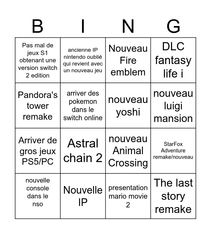 This bingo card has 16 words: Nouvelle IP, StarFox Adventure remake/nouveau, Nouveau Fire emblem, Pas mal de jeux S1 obtenant une version switch 2 edition, Arriver de gros jeux PS5/PC, ancienne IP nintendo oublié qui revient avec un nouveau jeu, nouveau Animal Crossing, presentation mario movie 2, Pandora's tower remake, arriver des pokemon dans le switch online, nouvelle console dans le nso, DLC fantasy life i, Astral chain 2, nouveau luigi mansion, nouveau yoshi and The last story remake.