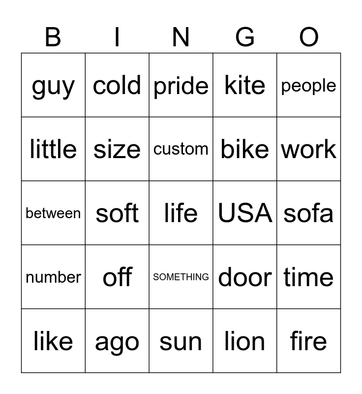 This bingo card has a free space and 24 words: off, ago, custom, like, people, guy, little, cold, USA, SOMETHING, bike, between, door, time, size, lion, sofa, pride, work, soft, fire, number, kite and sun.
