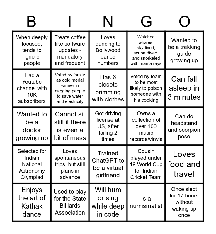 This bingo card has 28 words: Loves food and travel, Remains conscious even in dreams, Voted by team to be most likely to poison someone with his cooking, Is a numismatist, Had a Youtube channel with 10K subscribers, Loves dancing to Bollywood dance numbers, Treats coffee like software updates - mandatory and frequent, Selected for Indian National Astronomy Olympiad, Owns a collection of over 100 music records/vinyls, Enjoys the art of Kathak dance, Wanted to be a doctor growing up, Watched whales, skydived, scuba dived, and snorkeled with manta rays, Used to play for the State Billiards Association, Will hum or sing while deep in code, Can fall asleep in 3 minutes, Dropped a TV on his finger, Loves spontaneous trips, but still plans in advance, Voted by family as gold medal winner in nagging people to save water and electricity, Has 6 closets brimming with clothes, Trained ChatGPT to be a virtual girlfriend, When deeply focused, tends to ignore people, Once slept for 17 hours without waking up once, Got driving license at US, after failing 2 times, Cannot sit still if there is even a bit of mess, Can do headstand and scorpion pose, Cousin played under 19 World Cup for Indian Cricket Team, Wanted to be a trekking guide growing up and Sang a song at the airport in order to receive an exit stamp.