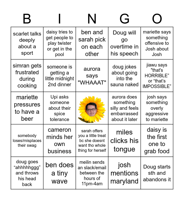 This bingo card has a free space and 24 words: cameron minds her own business, ben does a tiny wave, aurora says "WHAAAT", doug goes “ahhhhhggg” and throws his head back, mariette says something offensive to Josh about Josh, scarlet talks deeply about a sport, simran gets frustrated during cooking, daisy tries to get people to play twister or get in the pool, aurora does something silly and feels embarrassed about it later, sarah offers you a little treat bc she doesnt want tho whole thing for herself, doug jokes about going into the sauna naked, mariette pressures to have a beer, miles clicks his tongue, daisy is the first one to grab food, someone is getting a little midnight 2nd dinner, josh mentions maryland, josh says something overly aggressive to mariette, ben and sarah pick on each other, jiawu says "that's HORRIBLE” or “that’s IMPOSSIBLE”, Upi asks someone about their spice tolerance, Doug starts sth and abandons it, somebody loses/misplaces their swag, Doug will go overtime in his speech and meilin sends an slack/email between the hours of 11pm-4am.