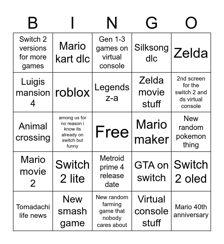 This bingo card has a free space and 24 words: Switch 2 lite, New smash game, Legends z-a, Tomadachi life news, Zelda, Switch 2 versions for more games, Luigis mansion 4, Mario kart dlc, Mario maker, Metroid prime 4 release date, Zelda movie stuff, Animal crossing, GTA on switch, Switch 2 oled, roblox, Virtual console stuff, New random pokemon thing, Gen 1-3 games on virtual console, 2nd screen for the switch 2 and ds virtual console, among us for no reason i know its already on switch but funny, Mario 40th anniversary, Mario movie 2, Silksong dlc and New random farming game that nobody cares about.