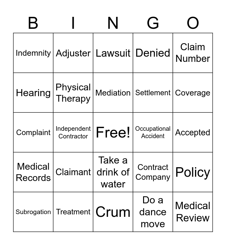 This bingo card has a free space and 24 words: Claimant, Treatment, Mediation, Subrogation, Claim Number, Indemnity, Hearing, Adjuster, Occupational Accident, Take a drink of water, Settlement, Complaint, Contract Company, Policy, Physical Therapy, Do a dance move, Accepted, Lawsuit, Coverage, Independent Contractor, Medical Review, Medical Records, Denied and Crum.