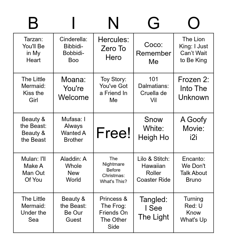 This bingo card has a free space and 24 words: Aladdin: A Whole New World, Beauty & the Beast: Be Our Guest, Toy Story: You've Got a Friend In Me, The Little Mermaid: Under the Sea, The Lion King: I Just Can’t Wait to Be King, Tarzan: You'll Be in My Heart, The Little Mermaid: Kiss the Girl, Cinderella: Bibbidi-Bobbidi-Boo, Snow White: Heigh Ho, The Nightmare Before Christmas: What's This?, 101 Dalmatians: Cruella de Vil, Beauty & the Beast: Beauty & the Beast, Lilo & Stitch: Hawaiian Roller Coaster Ride, Encanto: We Don't Talk About Bruno, Moana: You're Welcome, Tangled: I See The Light, A Goofy Movie: i2i, Hercules: Zero To Hero, Frozen 2: Into The Unknown, Mufasa: I Always Wanted A Brother, Turning Red: U Know What's Up, Mulan: I'll Make A Man Out Of You, Coco: Remember Me and Princess & The Frog: Friends On The Other Side.